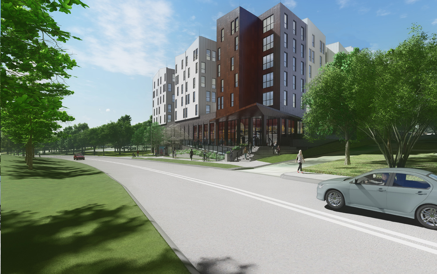 The first phase focuses on the “Site B” building — a 386,000 sf structure designed to support independent student lifestyles. The building will feature 216 sleeping units, ranging from studios to five-bedroom/five-bathroom apartments. Residents will enjoy in-unit laundry and kitchens, along with access to amenities such as a fitness center, study lounges, central courtyard, and pool. The building’s ground level will include approximately 8,000 sf of retail space, including the new home for Huskies Tavern. A future second phase will include the “Site A” building, anticipated to be similar in size and program.